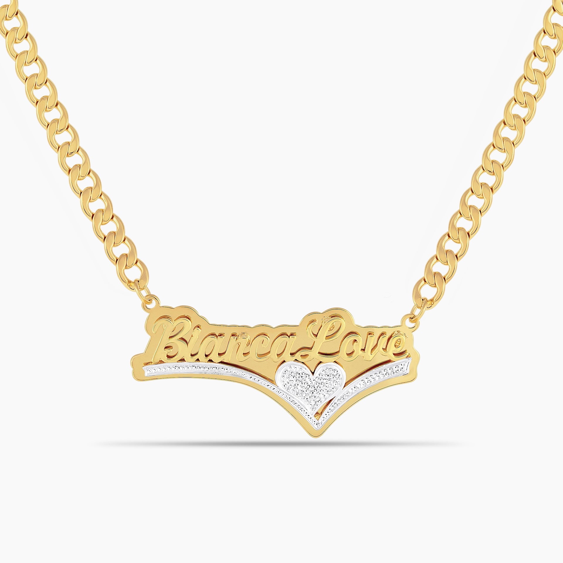 The Double Plated Lover’s Drop Necklace features a romantic script nameplate flowing into a graceful heart-accented drop. Its layered gold design adds elegance and a soft, sentimental finish.