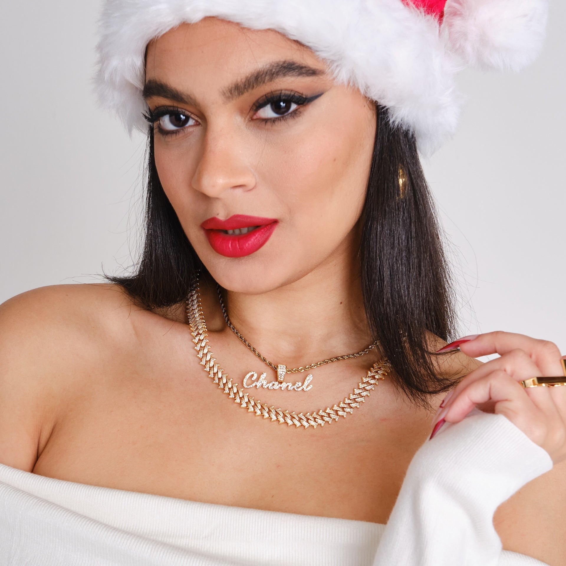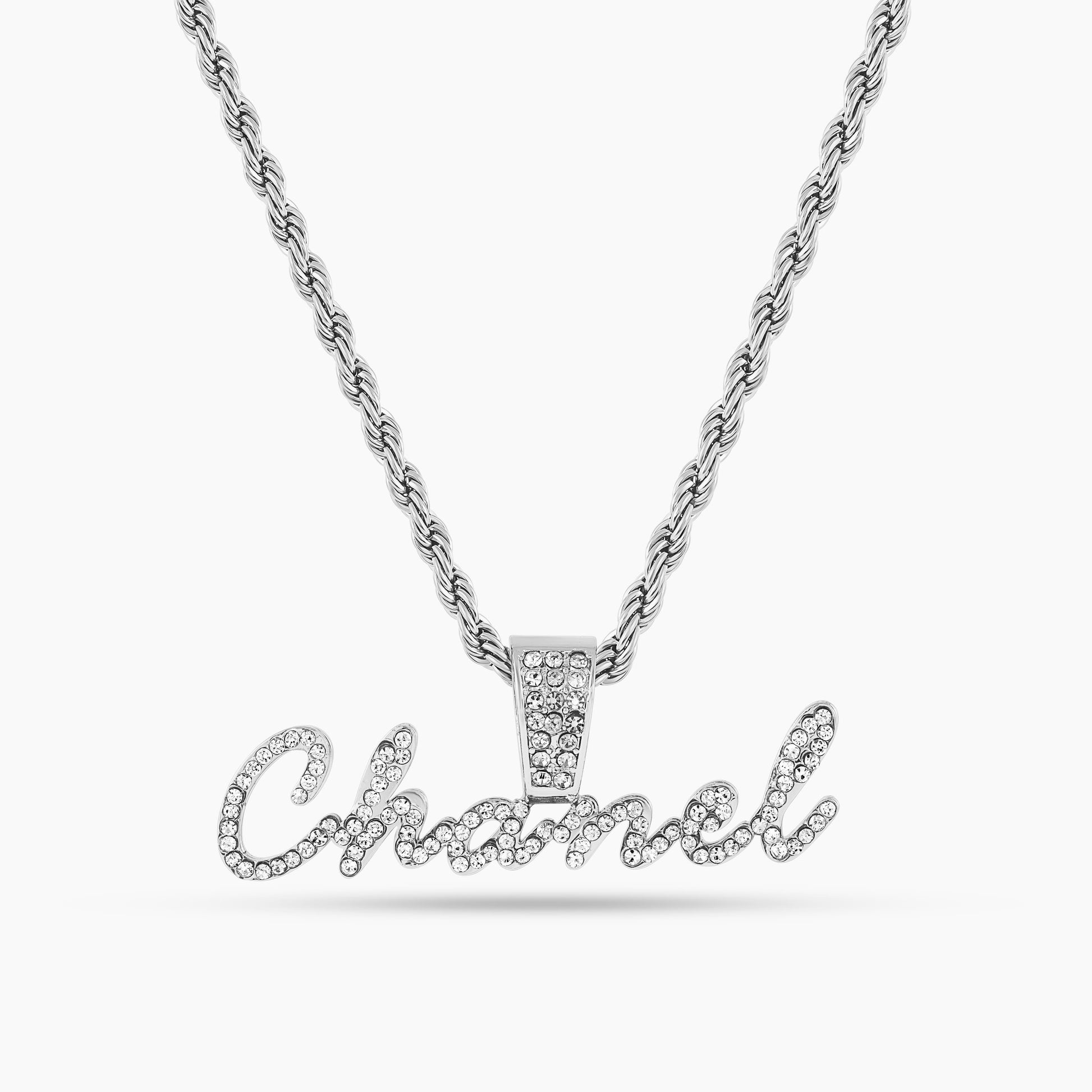 A dazzling custom name chain crafted in elegant script and fully iced with shimmering stones. Designed to shine from every angle, this luxe piece turns your name into a bold, sparkling statement made to stand out.