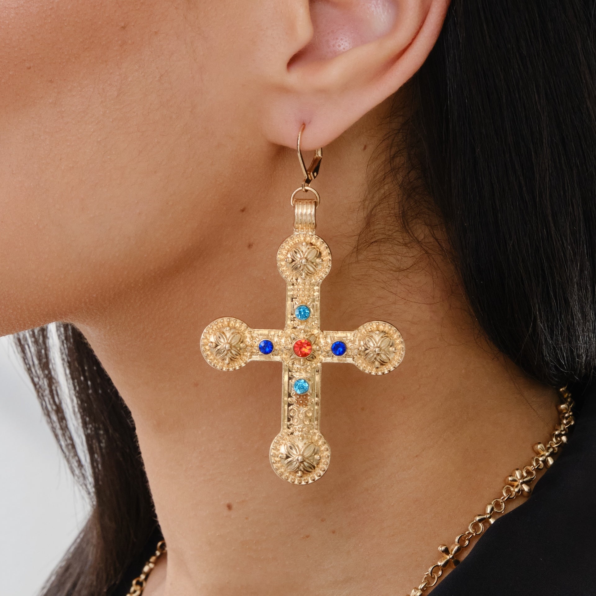 The Renaissance Cross Earrings bring a bold touch of vintage elegance to your look. Designed with intricate detailing and jewel-toned accents, each cross dangles from a secure leverback clasp for comfort and effortless wear. Style them solo or pair them with The Renaissance Catholic Cross for a complete statement set.