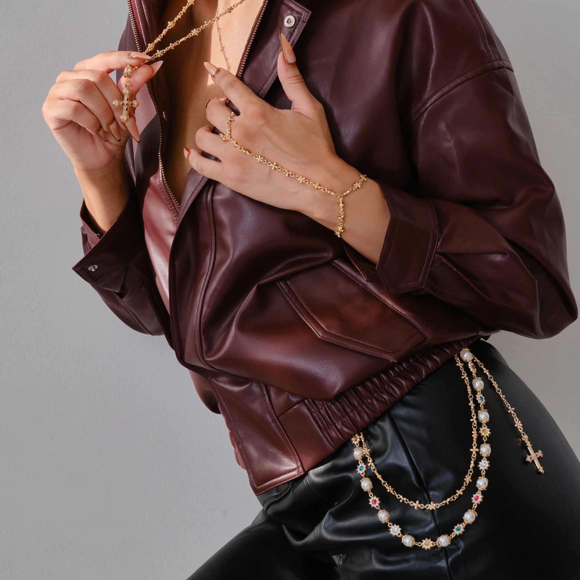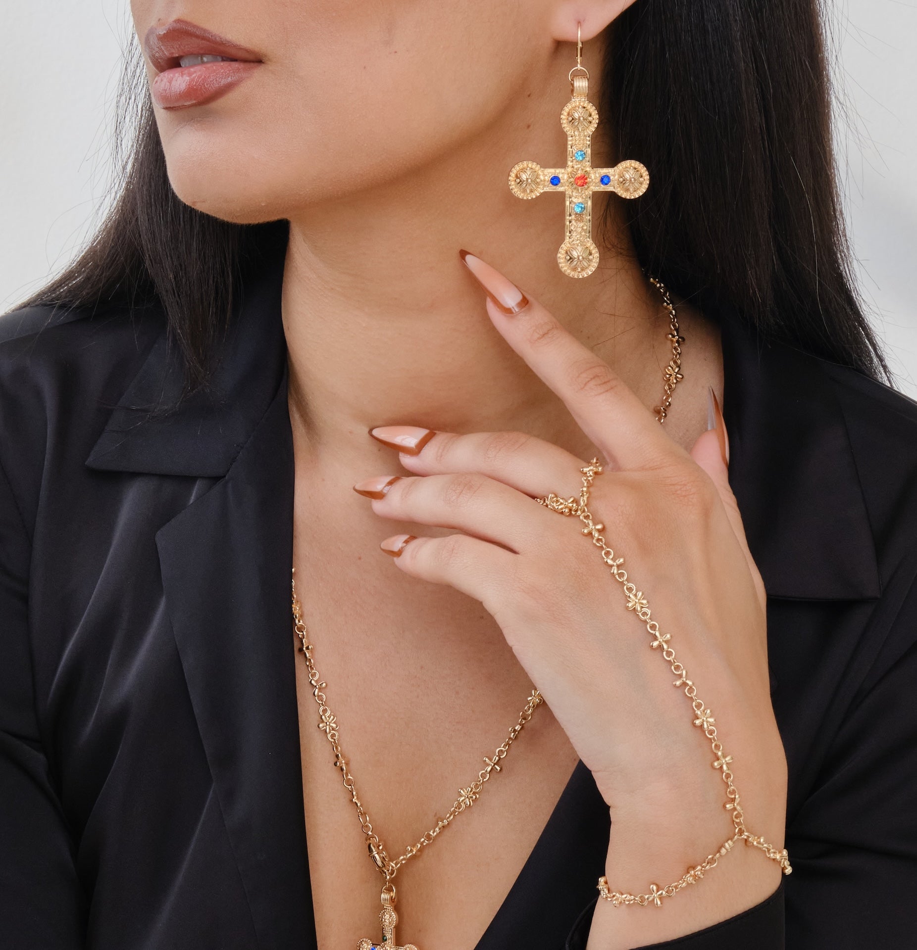 The Renaissance Hand Cross Chain turns timeless faith into a statement of style. It drapes elegantly across the hand with a delicate chain of mini crosses that connects your wrist to your finger. Refined yet bold, it pairs perfectly with The Renaissance Cross Necklace for a coordinated, head-turning look.
